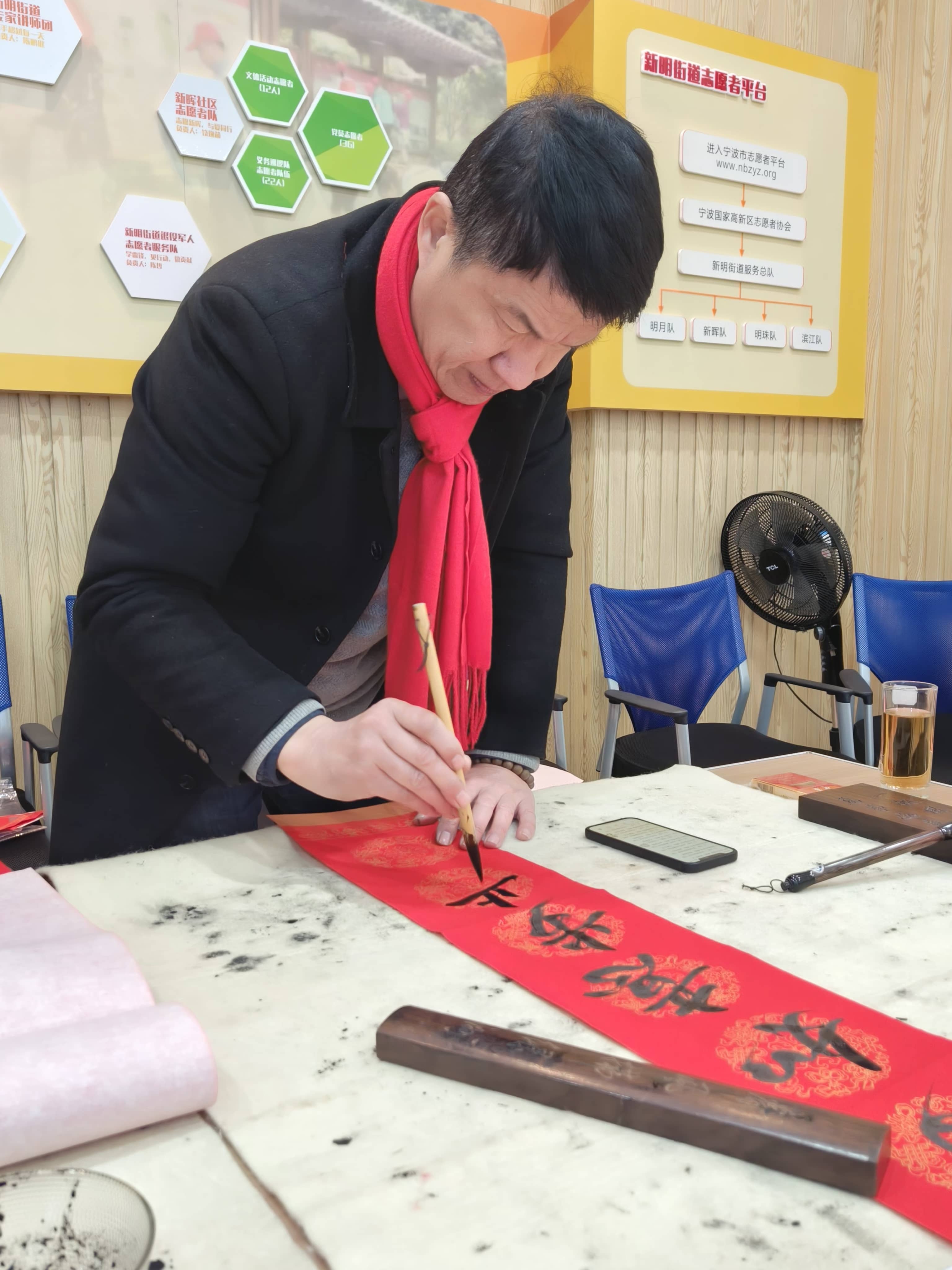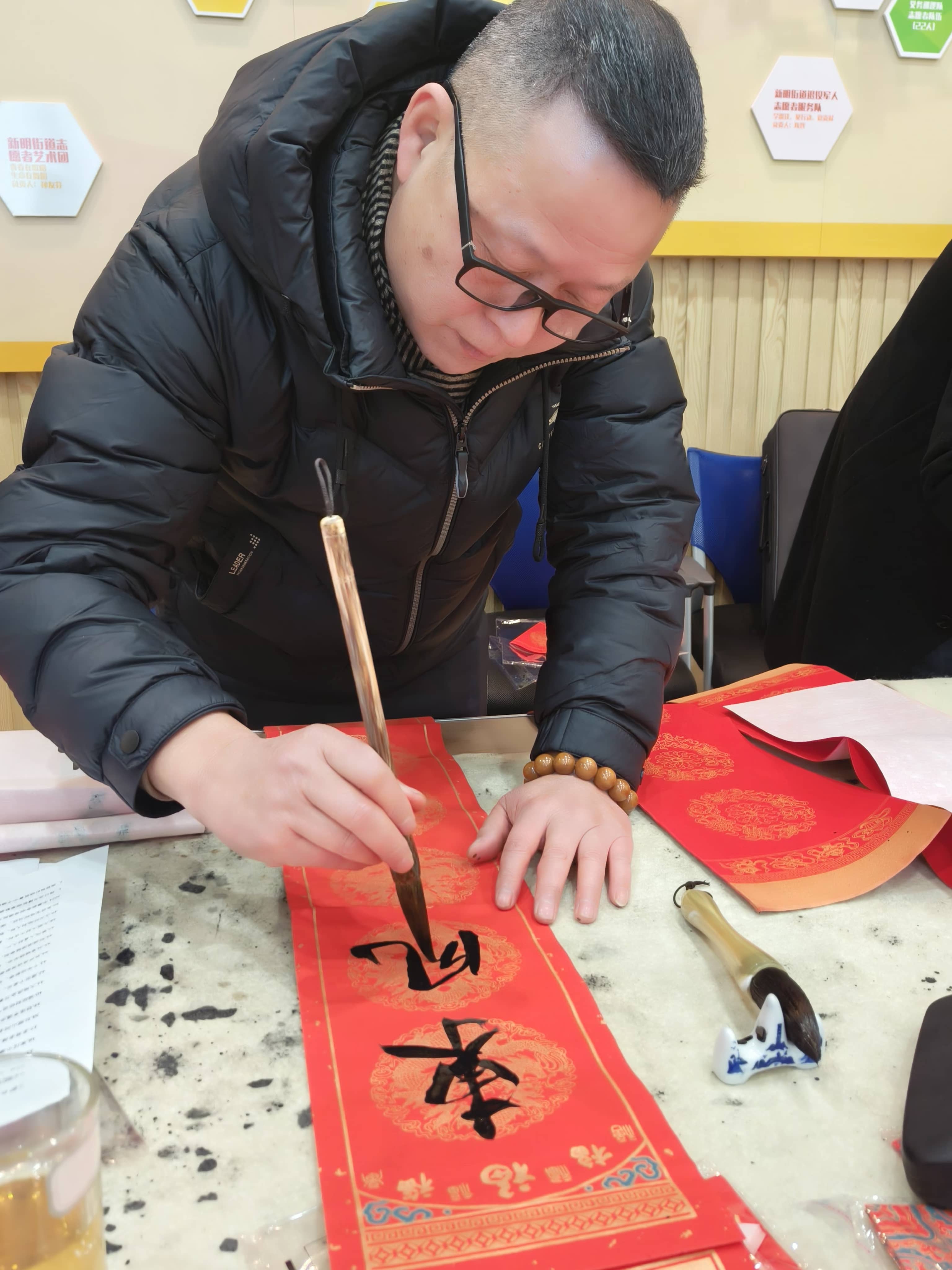 在活動的精彩環(huán)節(jié),書法家們滿懷熱情,揮毫潑墨,創(chuàng)作出一個個充滿神韻的“?!弊趾驮⒁饧榈拇郝?lián)。這些滿載祝福的藝術(shù)作品,不僅是對中華優(yōu)秀傳統(tǒng)文化的傳承,更是對美好幸福生活的向往。主辦方將這些作品送到社區(qū)群眾和10位最美志愿者手中。